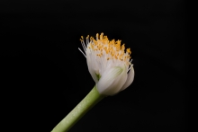 ▶꽃은 6-7월에 피며 황갈색이고 자방과 꽃받침 뒷면에 갈색 털이 있으며 꽃받침잎은 길이 15-20mm 나비 4-6mm로서 긴 타원형이고 꽃잎은 꽃받침잎과 비슷하며 다소 짧고 털이 없다. 순판은 황색이며 육질이고 넓은 난형으로서 끝이 둥글거나 둔하며 안쪽에 돌기가 있는 줄이 있고 가장자리가 잘게 갈라진다. 암술대는 약간 길게 굽는다.