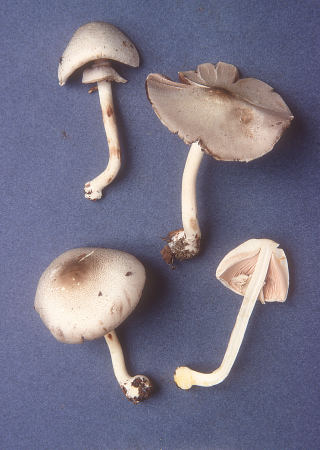 | 자실체 | 갓은 폭 3∼10cm의 소형∼중형. 둥근산형이다가 평평한 형이 된다. 허연색 바탕에 갓의 중앙은 미세한 흑갈색 인편이 밀집되어 있어 암색을 띤다. 비식용. 주름살은 어릴 때는 백색, 후에 분홍색을 띠다가 암갈색이 된다. 대에 떨어진 붙음. 대는 4∼8cm(굵기 6∼12mm), 원주형, 밑동에는 뚜렷한 돌출이 있다(둥근 모양을 이룬다). 백색, 표면은 평활하며, 고리는 크고, 2개의 층을 이룬다. |