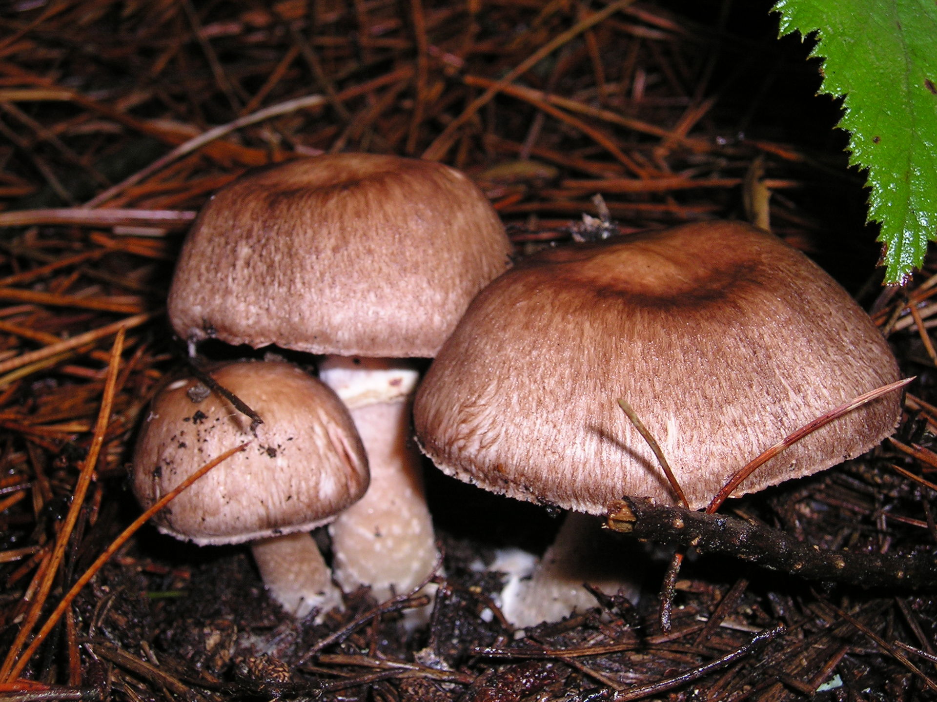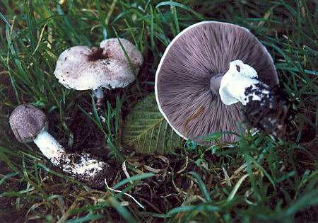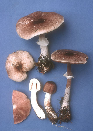 | 자실체 | 갓은 폭 5∼13cm 정도의 중형∼대형. 처음에는 반구형이다가 둥근산형, 평평한 형이 된다. 표면은 처음에는 모두 자갈색을 띤 섬유가 밀포되어 있으나, 갓이 퍼지면서 표피가 갈라져서 인편이 생긴다. 허연색∼연한 분홍색 끼의 바탕에 중앙부는 암자갈색∼흑갈색의 인편이 넓게 피복되어 있고 가장자리 쪽으로는 방사상으로 분산 피복되어 있다. 살은 백색. 식용하지 않는 것으로 기록되어 있다. 주름살은 백색이다가 곧 분홍색∼흑갈색으로 변한다. 폭이 좁고 빽빽하며 대에 떨어진 붙음. 대는 6∼15cm(굵기10∼25mm), 아래쪽으로 굵어진다. 백색이고 상부는 후에 연한 홍색∼갈색을 띤다. 고리는 백색의 큰 막질이고 늘어져 있다. 고리의 아래쪽은 솜 찌꺼기 모양의 거스름이 덮여 있다. |