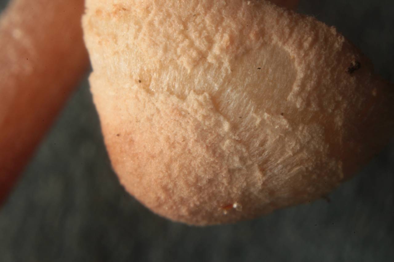 | 자실체 | 갓은 폭 2∼3cm 정도의 소형. 둥근산형이다가 평평한 형이 된다. 처음에는 분홍색이다가 오래되면 분홍갈색이 되고 촘촘하게 분상∼알갱이 모양의 피복물이 덮여 있다. 가장자리 끝에는 피막 잔재물이 거치상으로 붙어 있다. 살은 백색. 밑동 쪽은 분홍색 끼를 띠게 된다. 주름살은 백색이다가 크림색이 된다. 약간 촘촘하고 대에 떨어진 붙음. 포자문은 백색. 대는 5∼6cm(굵기3∼5mm), 꼭지 쪽은 백색, 고리 아래쪽은 갓과 같은 색. 고리는 좁고 곧 소실된다. |
