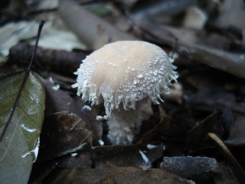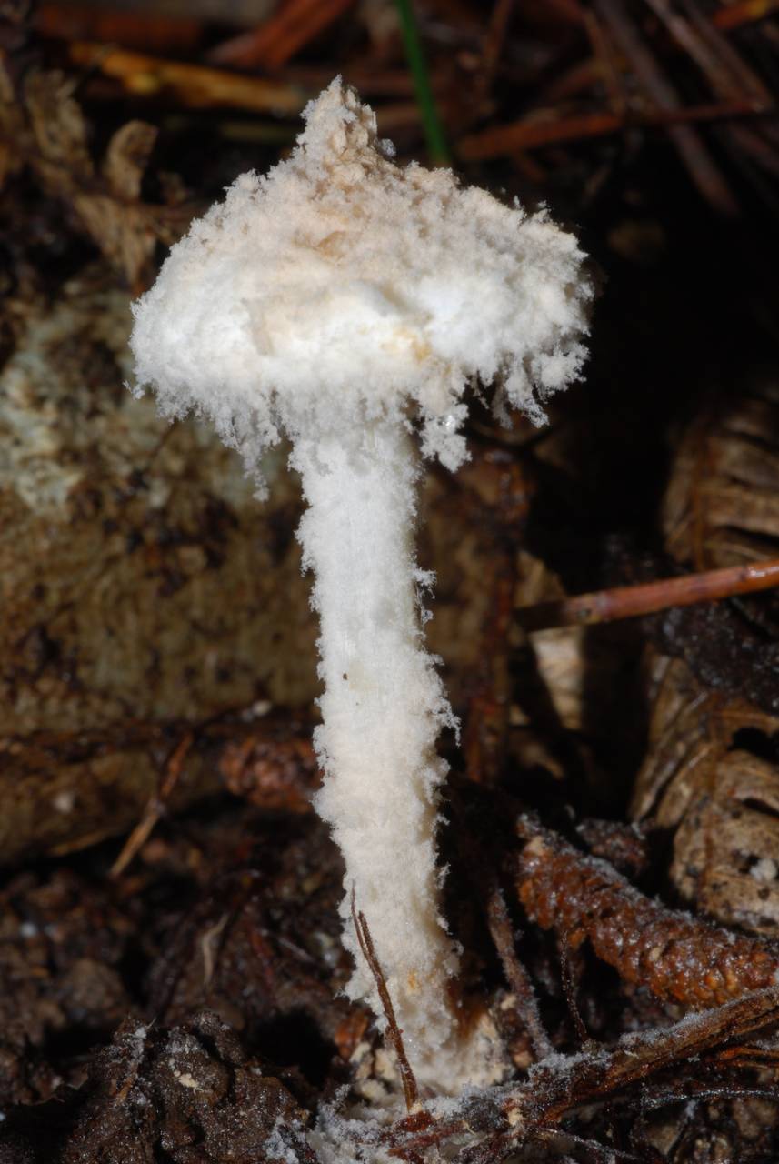 | 자실체 | 갓은 폭 1.3∼2cm 정도의 극소형. 원추상종형이다가 둥근산형이 된다. 표면의 바탕색은 백색인데, 백색∼담갈색의 면질∼분질물이 두껍게 피복되어 있다. 가장자리 끝은 분질의 외피막 파편이 붙어 있다. 이 분질물은 손으로 만지면 묻기 쉽다. 살은 매우 얇고 백색. 식독 불명. 주름살는 백색이다가 갈색의 얼룩이 지고 약간 촘촘하며 대에 떨어진 붙음. 대는 2∼4cm(굵기1.5∼2mm), 표면과 같은 분질물이 붙어 있으며, 위쪽에 면질∼분질의 고리가 있고 소실되기 쉽다. |