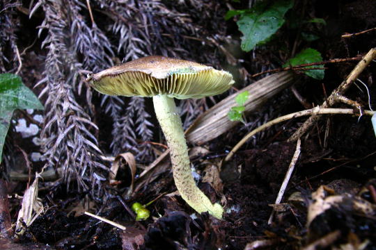 | 자실체 | 갓은 폭 2.5∼3cm 정도의 소형. 원추상 또는 둥근산형이다가 평평한 형이 되며, 중앙이 약간 돌출된다. 바탕색은 담황색인데 회갈색∼암갈색의 표피 인편이 찢어져서 점 모양으로 산재되고 중앙에 밀집된다. 살은 황색. 상처를 받으면 청변한다. 식독 불명. 주름살은 레몬황색. 약간 성기며 대에 떨어진 붙음. 대는 길이3∼5.5cm(굵기2∼3mm), 밑동이 약간 굵다. 담황색의 바탕에 회갈색의 가는 인편이 산재한다. 고리는 솜 찌끼 모양이고 조락성이다. 속이 비어 있다. |