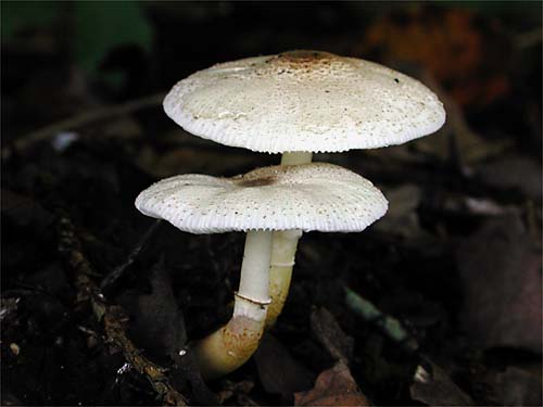 | 자실체 | 갓은 2∼5cm의 소형. 둥근산형이다가 평평해 진 후 중앙이 약간 오목해 진다. 연한 갈색. 가장자리에는 방사상의 홈선이 생긴다. 표면에는 암자갈색의 미세한 비늘이 퍼져 있고 중앙부가 진하다. 살은 얇고 백색. 식독 불명. 주름살은 백색. 홈붙음. 대는 길이4∼7cm(굵기5∼10mm), 위쪽은 백색이고 아래쪽은 암갈색. 미세하게 면모상이다. 위쪽에 백색의 막질 고리가 있으나 조락성이다. |