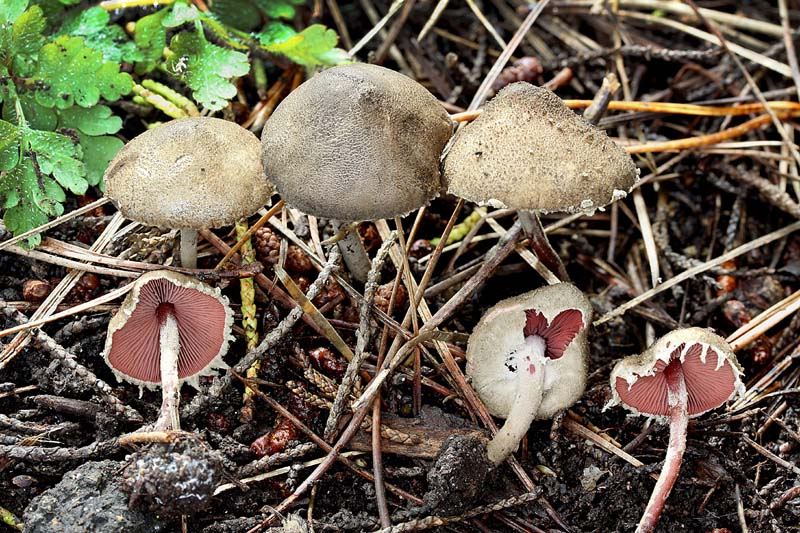 | 특징 | 극소형∼소형. 갓과 대에 회갈색 분질물이 덮여 있고, 주름살이 분홍색∼암적색. 가장자리 피막 잔존물. 이 버섯은 책자에 따라 다소 설명에 차이가 있다. |