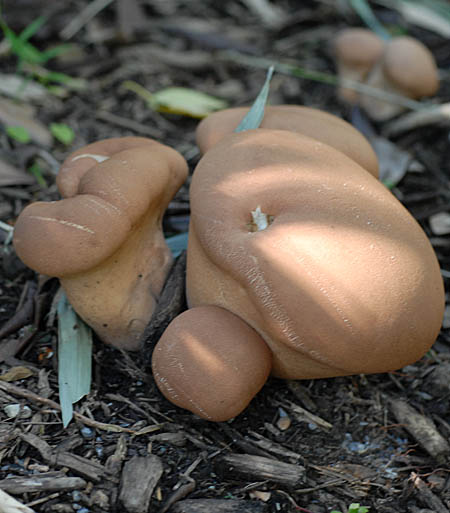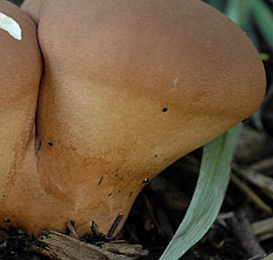 | 자실체 | 자실체는 폭 4∼14cm, 높이 5∼10cm 정도, 성숙한 것은 말징버섯 보다 폭이 넓은 경우가 많다. 팽이모양∼서양 배 모양, 어릴 때는 황갈색∼다색, 후에 적갈색∼암다갈색이 된다. 표면은 거친 털이 덮여 있어서, 말징버섯의 평활하거나 분상인 것과 차이가 있다. 노숙하면 머리의 측면에 세로로 많은 주름이 생기기도 한다. 기본체는 절단해 보면, 얇은 2중의 외피막 내부에 기본체가 있다. 기본체는 위쪽에 포자가 생기고, 하부에는 포자가 없는 무성기부가 된다. 처음에는 백색, 후에 갈색∼암갈색이 된다. 오래되면 탈수되어 가루 모양이 된다. 건조하면 외피가 탈락하면서 포자가 비산되고 후에는 스펀지 모양으로 변한 무성기부만 남게 된다. |