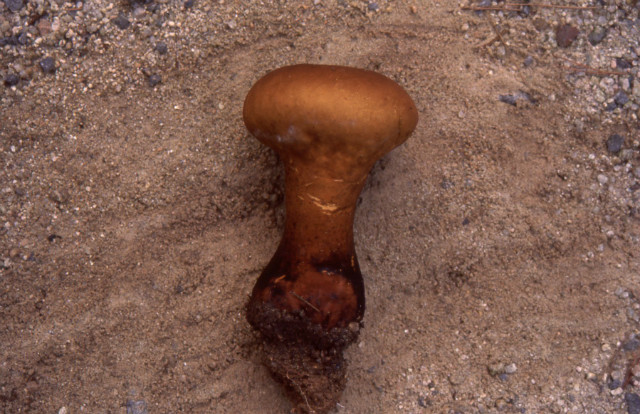 자실체 자실체는 거꾸로 된 원추형∼팽이형이고, 높이 4∼5cm, 지름은 위쪽 4∼5cm, 중간쯤은 2∼2.5cm, 밑동에 가까울수록 좁아진다. 외피는 회갈색이고 불규칙하게 파열된다.