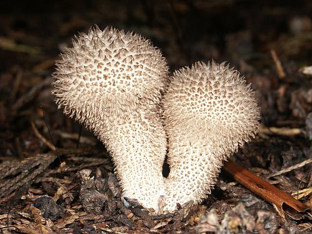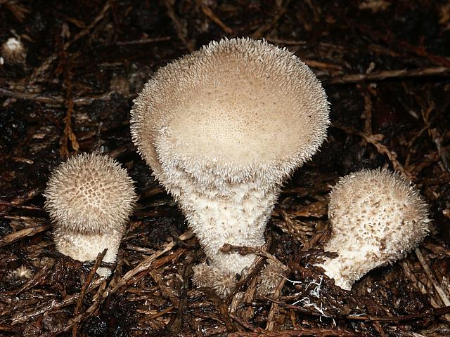 | 자실체 | 자실체는 머리 부분은 납작한 구형이고 다소 짧은 대가 있어서 짧은 서양 배 모양이다(*긴목말불버섯, L. spadiceum처럼 대가 길지는 않다). 머리의 지름은 2∼5cm, 길이는 3∼5(6)cm 정도. 외피에 1∼2mm 정도의 가시가 밀생되고 몇 개의 가시 끝이 모여져서 피라밋 모양이 되는 특징이 있다. 처음에는 크림 백색이다가 황갈색으로 된다. 가시가 탈락하면 내피에 그물눈 모양의 흔적이 약간 남지만 다소 매끄러운 모양이 된다. 내피는 회갈색∼황토갈색이 되고 꼭지 부분에 원형 구멍이 생겨 포자가 비산된다. 기본체(살)은 처음에 흰색이나 후에 올리브갈색이 된다. 포자는 회갈색∼갈색. 절단해 보면 무성기부가 길게 발달해 있다. |