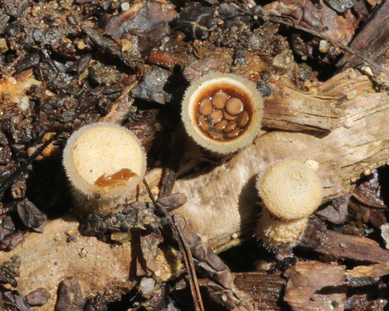자실체 : 자실체는 팽이모양∼거꾸로 된 원추형, 각피는 3층으로 되어 있어서 외피는 황갈색∼암갈색의 거친 털로 덮여 있으며, 성숙하면 점차 머리 부분이 벌어지면서 머리 부분의 흰색의 내피가 들어났다가 이 내피도 탈락하고 내부의 알 모양의 소피자가 들어난다. 자실체는 높이 5∼12mm, 지름 5∼8mm 정도. 각피의 내벽 표면은 연한 회색, 흑색 등 다양하다. 광택이 있고 세로로 홈이 파여져 있는 특징이 있다.