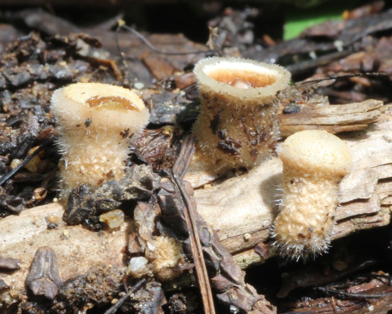 자실체 자실체는 어릴 때 흰색의 털이 덮여 있고 아구형이나 성숙하면 위쪽이 열리면서 소주잔 모양으로 바닥이 다소 좁은 형태가 된다. 폭 4∼8mm, 높이 5∼10mm 정도. 각피는 1층, 내측은 평활, 담갈색. 광택이 있다.