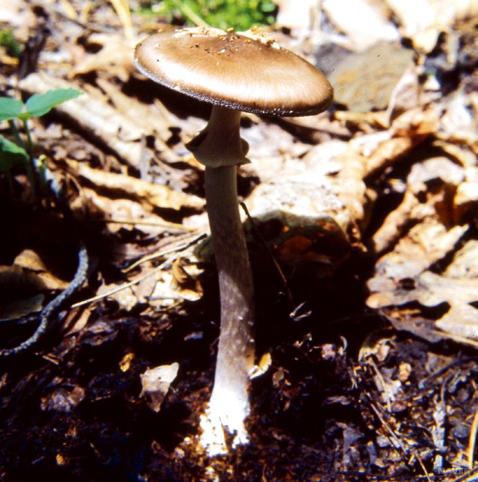 | 자실체 | 갓은 폭 5∼14cm의 중형∼대형. 둥근산형∼얕은 둥근산형이 되며, 흔히 중앙이 약간 돌출된다. 연한 흑갈색∼갈흑색, 중앙이 진하고 가장자리 쪽으로 연해진다. 가장자리는 뚜렷한 줄무늬 홈선이 있다. 갓 위에 외피막 잔존물이 백색 또는 오백색으로 반점이나 막 모양으로 남아 있다. 살은 백색. 주름살은 백색, 폭이 넓고, 촘촘하며, 대에 떨어진 붙음. 주름살 사이의 짧은 주름살이 사각형 모양이다. 대는 길이길이 8∼22cm(굵기는 17∼27mm). 거의 원주형이며, 고리는 없고, 위쪽은 백색∼허연색, 아래쪽은 회색 끼를 띤다. 속이 비었고, 밑동에 구근 모양은 생기지 않고, 2.5∼7cm 높이의 주머니 모양 백색∼오백색 막질로 덮여 있다. |