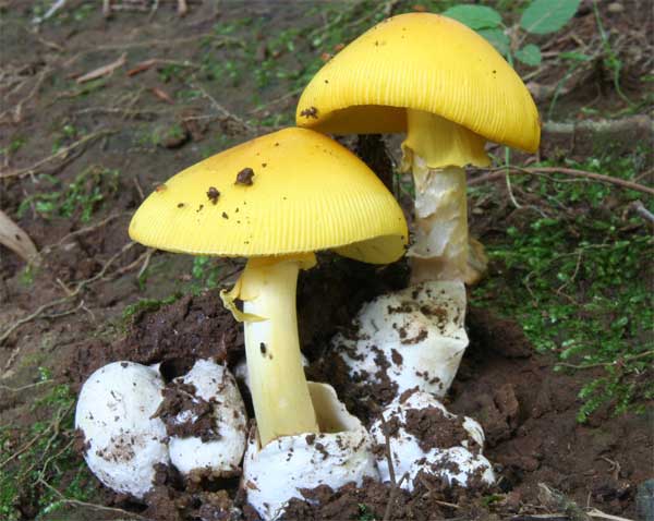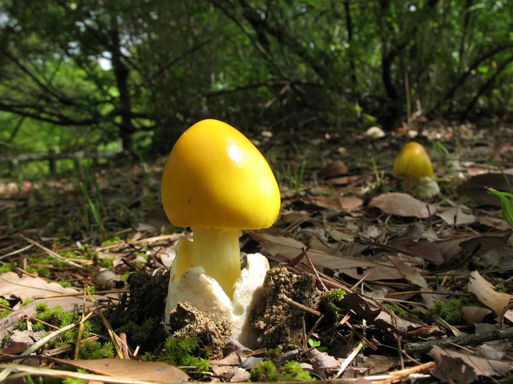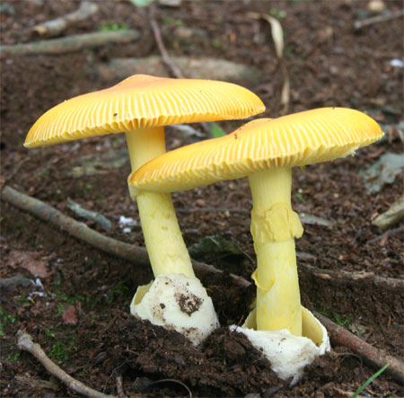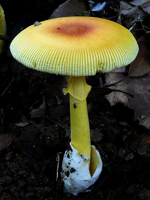 | 자실체 | 갓은 오렌지 황색∼황색이고 중앙은 다소 황토색이다. 방사상으로 선명한 줄금이 보인다. 대는 길이갓보다 다소 연한 색 바탕에 오렌지색∼레몬색의 얼룩덜룩한 모양이 된다. 오렌지 황색 막질의 고리가 있다. 밑동에 주머니 모양 외피막이 있고 백색. |