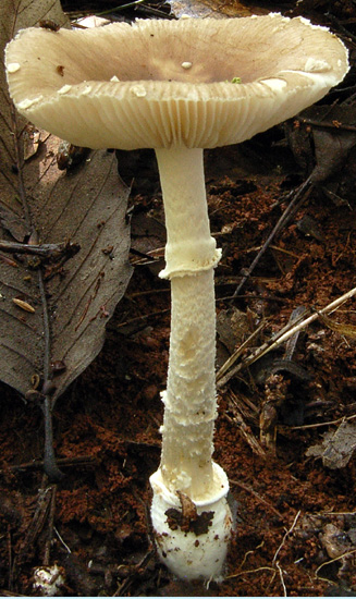 | 자실체 | 갓은 3.5~6cm, 처음 산모양에서 편평하게 되지만 가끔 중앙이 들어간다. 회색에서 황토색으로 되며 중앙은 갈색, 습할 시 점성이 있다. 사마귀 잔편은 오백색 또는 회색에서 황색으로 되며 중앙에 밀집되며 상처를 받아도 변색하지 않는다. 가장자리는 결절의 줄무늬선이 있다. 살은 백색이고 냄새는 불분명하다. 주름살은 끝붙은주름살이고 백색으로 밀생하며 변두리는 미세한 털과 인편이 있다. 대는 4~9cm, 굵기는 0.5~1cm로 원주형이나 위쪽으로 가늘며 오백색에서 황색 또는 회색의 대주머니 잔편이 있다. 턱받이는 위쪽에 있고 백색이며 막질이고 과립으로 덮인다. 꼭대기는 백색이고 섬유상에서 매끈해지며 속은 푸석푸석한 상태에서 빈다. 기부는 아구형 모양으로 부풀고 백색에서 퇴색한다. 대주머니는 둥근모양이며 대주머니 잔편은 과립으로 되며 작은 사마귀점이 있다. |