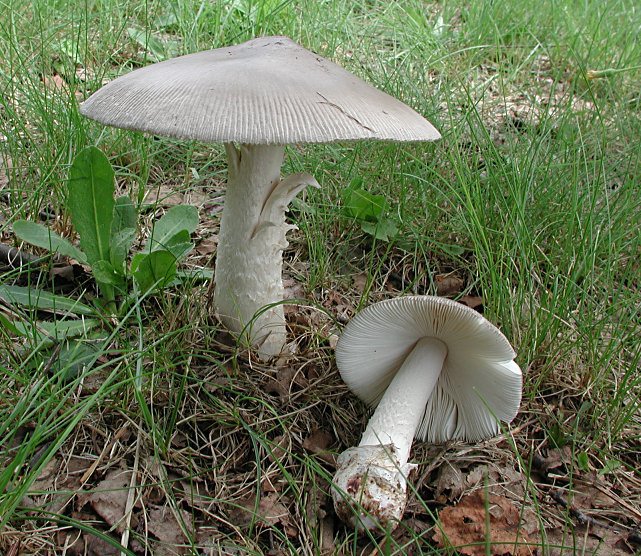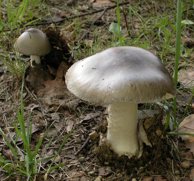 | 자실체 | 갓은 폭 3∼6cm의 소형∼중형. 우산버섯보다 다소 작은 편이다. 처음에는 둥근산형이다가 후에 평평한 형이 되며, 간혹 중앙이 오목해 지기도 한다. 회색, 때때로 약한 갈색끼를 띠며, 드물게 거의 흰색∼회백색인 것도 있다. 표면은 평활하지만 가장자리에 20∼30% 정도 폭의 방사상 줄무늬가 보인다. 때때로 허연색∼회색 끼를 띤 외피막 잔존물이 붙어 있다. 살은 얇고 백색. 식독 불명. 일부 식용이라고도 하나 유사한 독버섯이 많으므로 피해야 한다. 주름살은 백색. 오래되면 회색 끼를 띠기도 한다. 약간 성기며, 폭이 넓고, 대에 떨어진 붙음. 대는 길이5∼8cm(굵기5∼12mm), 아원주형, 위쪽으로 약간 가늘어진다. 백색, 오백색 거의 평활하고, 속이 비어 있다. 대에 고리가 있는 경우도 있고, 탈락해서 없는 경우도 있다. 밑동에는 대주머니가 있다. 크기는 1.5∼2×1∼1.5cm 정도. |
