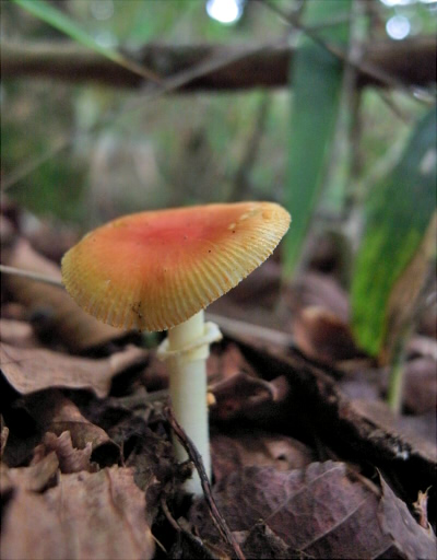 | 특징 | 소형. 붉은 외피막(rubrovolvảtus) 버섯. 갓은 선명한 적색, 대는 오렌지 황색, 밑동은 황적색. |