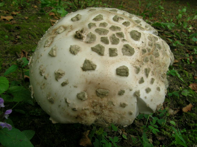 자실체 갓은 폭 6∼20cm의 중형∼거대형. 형태가 다소 다양하다. 어릴 때는 구형이다가 후에 둥근산형, 평평한 형이 되고 중앙부가 약간 오목해져서 접시 모양을 이룬다. 표면은 건조하고 백색∼연한 회백색, 두껍고 큰 평평한 형 또는 분상의 백색∼연한 회백색 사마귀가 촘촘히 붙어 있으나 탈락되기 쉽다. 줄금은 없고 가장자리 끝에는 분질 또는 면질의 현저한 막편이 부착되어 있다. 살은 백색. 연하다. 식독 불명.