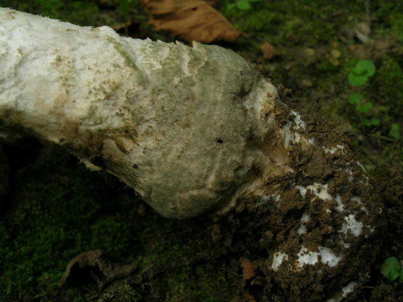 대는 길이6∼15cm(굵기1∼3cm), 위쪽이 약간 가늘고 백색∼허연색. 처음에는 두꺼운 솜 찌꺼기 또는 분상의 인편이 피복되고 후에 소실되어 가는 인편만 남게 된다. 밑동은 구근상, 다소 뿌리모양 또는 둥근 모양. 속이 차 있다. 위쪽에는 막질이고 백색이다가 탁한 황색이 되는 고리가 있는데, 소실되기 쉽다.