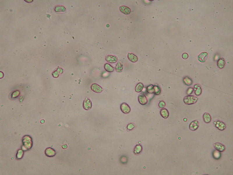 포자 포자는 넓은 타원형. 평활, 투명, 10.2∼12.3×7.4∼8.8㎛. 포자문은 백색.