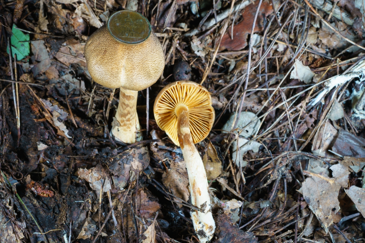| 자실체 | 갓은 3.5∼8cm의 소형∼중형. 처음에는 둥근산형이다가 후에 거의 평평하게 퍼진다. 표면의 바탕색은 담황색∼담황토색인데 암갈색∼검은색의 많은 인편을 부착하고 있으며 특히 중앙 부근은 거스름 모양 또는 가시 모양이다. 살은 약간 부서지기 쉽고 허연색 또는 다소 황토색을 띤다. 주름살은 계피 색을 띠고 폭은 좁은 편, 약간 성기고 대에 띠붙음. 대는 4∼9cm(굵기6∼14mm), 아래쪽은 곤봉 모양으로 부풀어 있다. 갓의 표면과 같은 색이고, 거미줄 막 아래는 검은색의 인편이 부착되어 있다. 속이 비어 있다. |
