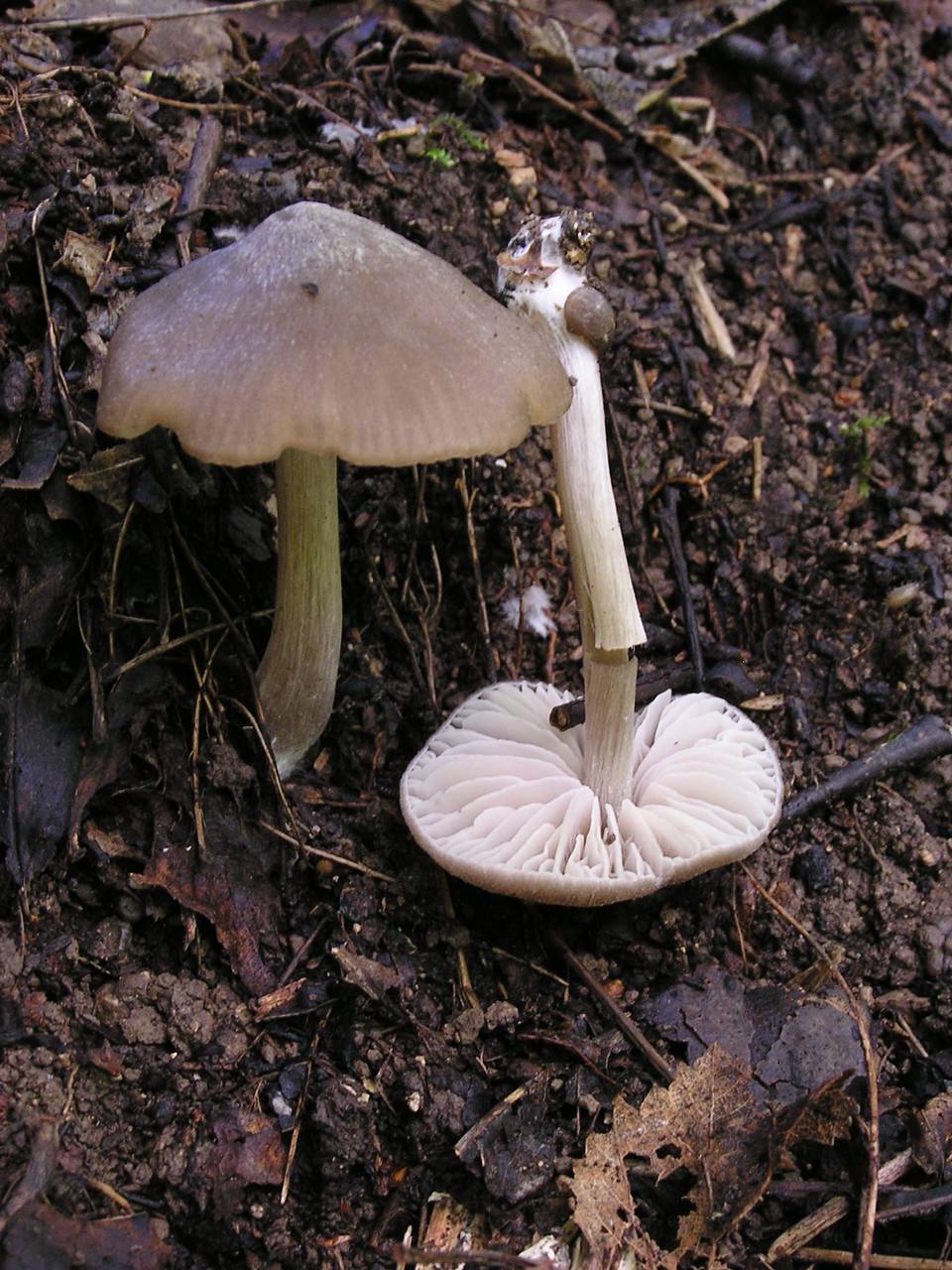 특징 : 소형. 갓은 백색∼연한 재회색, 습하면 회색, 후에 연한 회색으로 퇴색. 대의 밑동이 흔히 굽어있다. 이 버섯은 학명이 혼동되었으나 Hesler에 의해서 고쳐졌다.