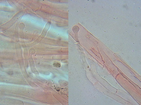 | 자실체 | 갓은 폭 0.5∼1cm의 극소형. 어릴 때는 둥근산형이나 곧 평평해지고 중앙이 약간 오목하게 들어간다. 표면은 평활하고 약간 흡습성, 크림백색 바탕에 미세한 백색의 솜털이 있다. 습할 때는 가장자리에 줄금이 있으며, 오래되면 가장자리가 갈변한다. 식용. 주름살은 어릴 때는 백색, 후에 분홍색. 폭이 좁고 성기며 대에 내리붙음. 날은 고르다. 대는 2∼3cm(굵기0.5∼1.5mm), 원주상, 속이 차 있거나 비어 있고 부러지기 쉬우며, 허연색으로 반투명하다. 표면은 평활하지만 전면에 미세한 백색 털이 있다. |