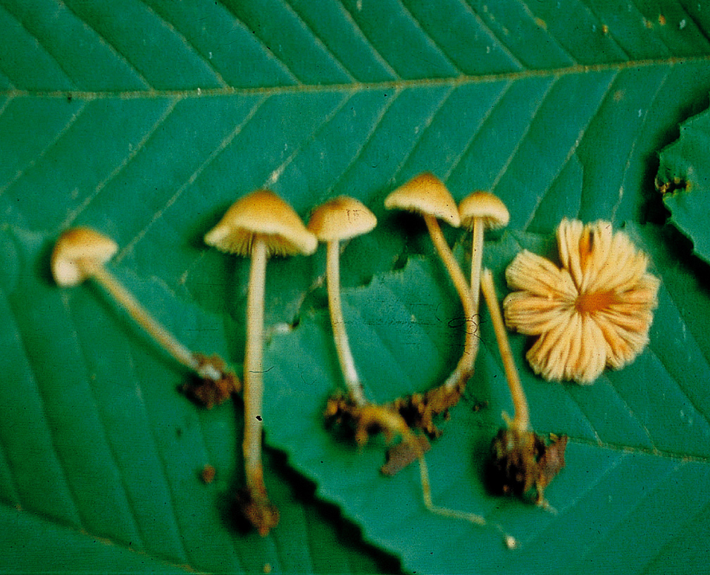 | 자실체 | 갓은 폭 1.5∼3(5)cm의 극소형∼소형. 평평하게 퍼지거나 또는 편평형이 된다. 표면은 평활, 회갈색∼회색을 띤 올리브색, 중앙은 검은 색. 방사상으로 줄무늬가 있다. 가장자리는 안쪽으로 감겨 있으나, 오래되면 흔히 위쪽으로 감긴다. 살은 얇고 허연색. 식독 불명. 주름살은 처음에는 회색을 띠나 후에 회분홍색. 폭은 넓고, 촘촘하며, 방추상. 대에 내리붙음이면서 홈붙음이다. 대는 3∼4(8)cm(굵기2∼4mm), 원주상으로 가늘고 길며, 광택이 있는 백색. 꼭지는 분상. 표면에 미세한 줄무늬가 있고 속이 차 있다. |