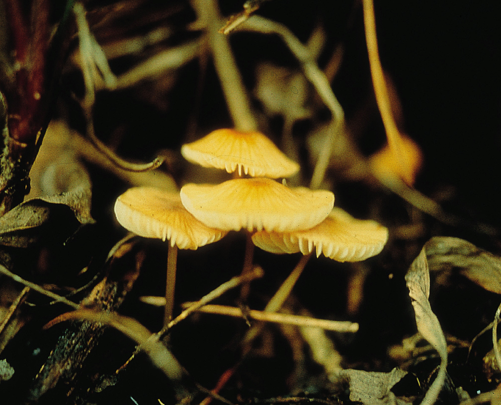 | 자실체 | 갓은 폭 1.4∼4cm의 극소형∼소형. 위가 잘린 둥근산형∼배꼽을 가진 넓은 종형이 된다. 백색∼황색끼를 가진 허연색에서 황토색이 되며, 중앙이 갈색이다. 오래되면 약간 오목한 형이 된다. 표면에 처음엔 미세한 섬유가 있으나 차차 평활해지고 가장자리에는 뚜렷한 줄무늬가 있다. 흡습성. 살은 백색. 식독 불명. 주름살은 백색∼연한 분홍색, 후에 분홍색이 된다. 촘촘하며 다소 빽빽한 편. 약간 대에 내리붙음∼홈붙음. 날은 고르고 같은 색. 대는 2.5∼5.3cm(굵기1∼2mm), 원주상, 상하 같은 굵기. 백색. 부서지기 쉽고 속이 비었다. 표면은 평활하나 때로는 밑동에 털이 나 있는 것도 있다. |
