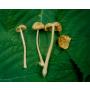 | 자실체 | 갓은 폭 2∼2.5cm. 둥근산형이다가 약간 오목한 형이 된다. 표면은 연기색∼담황색, 평활, 광택이 있다. 가장자리는 어릴 때 안쪽으로 굽으며, 고르다. 살은 얇고 백색. 식독 불명. 주름살은 허연색이다가 연한 분홍색이 된다. 폭이 좁고 다소 성긴 편이며 대에 홈붙음. 날은 고르지 않다. 대는 4cm 내외(굵기 3mm 내외). 담황색. 꼭지와 밑동은 백색. 평활하고 매끄럽다. |