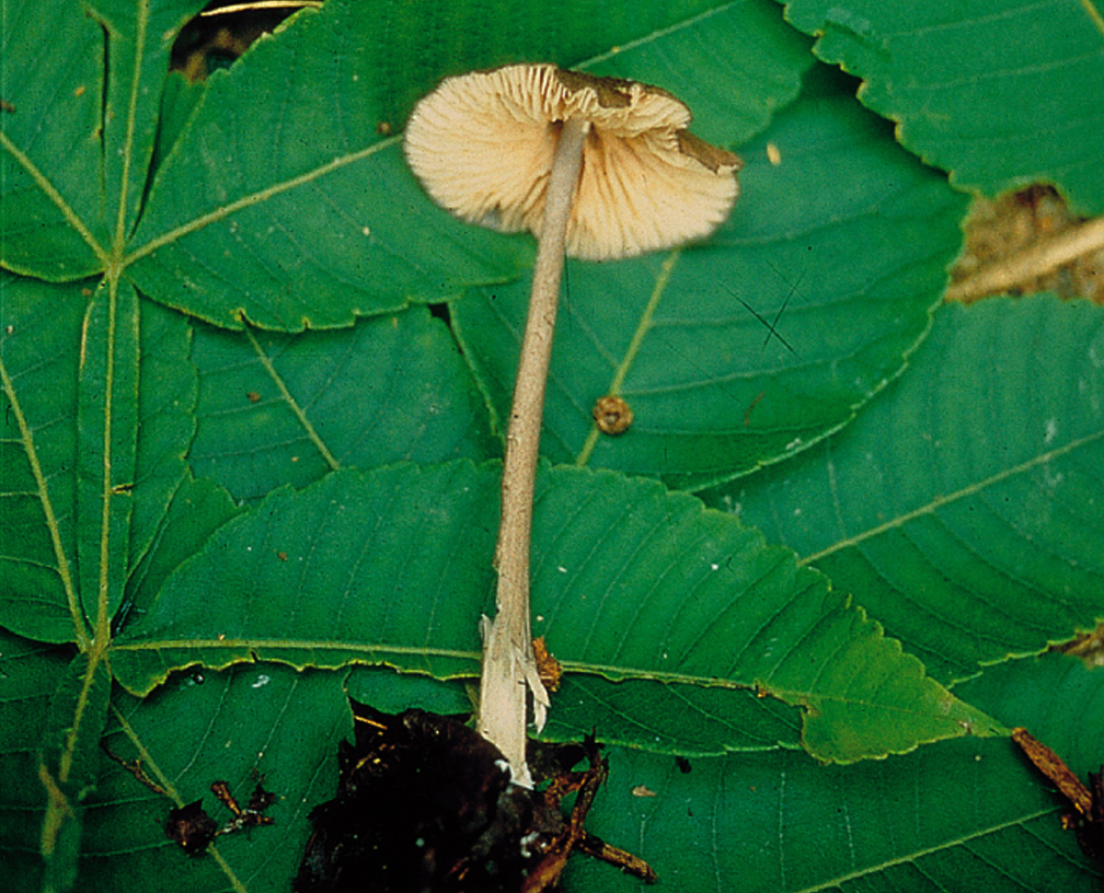 | 자실체 | 갓은 폭 1∼4cm의 극소형∼소형. 둥근산형, 중앙에 깊게 배꼽모양 쏙 들어간다. 균일하게 연한 회갈색. 건조하면 더 암색을 띤다. 암회색 또는 암갈색 섬유상 인편이 중앙부에 있다. 가장자리는 미세한 줄무늬가 있다. 살은 얇고 갓보다 다소 연한 색. 식독 불명. 주름살은 허연색이다가 분홍색이 된다. 대에 치붙음 또는 약간 띠붙음. 폭은 보통∼다소 좁으며, 다소 성기거나 성기다. 날은 고르고 같은 색. 대는 3∼6cm(굵기2∼3mm), 회갈색∼백회색, 꼭지는 백색. 평활, 상하 같은 굵기 또는 아래쪽에 약간 부풀어 있고 속이 차 있다. 밑동에는 백색균사가 있다. |