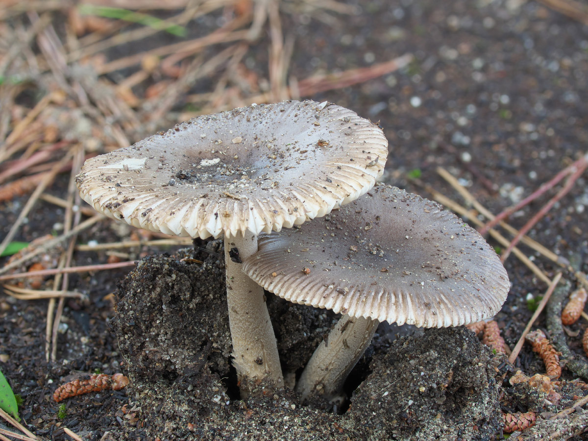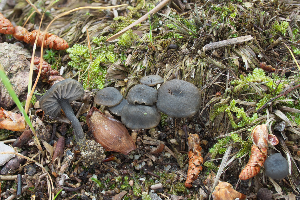 | 자실체 | 갓은 폭 0.8∼2.2cm의 극소형. 둔한 원추형이다가 나중에 중앙이 높고 평평해 진다. 표면은 흡수성이 있고 회색 내지 회갈색이나 중앙부는 거의 흑색인데 습할 때는 긴 줄금을 나타낸다. 살은 얇고 갓과 같은 색. 식독 불명. 주름살은 회색을 띠며 폭이 1∼3mm, 두껍고 성글며 대에 치붙음 또는 띠붙음. 대는 1.8∼3.5cm(굵기1.5∼3mm), 중심생이며 다소 섬유상이고, 갓과 같은 색. 속이 비어 있다. |