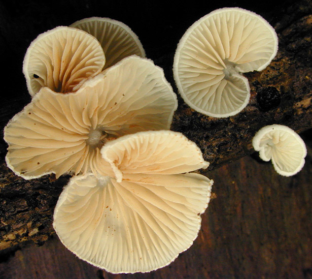 | 자실체 | 갓은 직경 6∼15(20)mm의 극소형. 둥근 모양이거나 조개껍질 모양. 흔히 측생으로 기물에 붙어있다. 만약 중앙에 붙어 있다면 둥근 모양이 된다. 표면은 불규칙하게 방사상으로 주름이 잡혀 있고, 미세하게 털이 나있다. 측생된 부근에는 면모상 털이 있다. 처음에는 백색∼연한 회백색이다가 후에는 칙칙한 황토색∼적황토색이 된다. 가장자리는 날카롭고 가는 톱니꼴이다. 살은 얇고 허연색. 주름살은 백색이다가 후에 칙칙한 회황색을 띤다. 성기며 폭이 다소 넓다. 대는 거의 대가 없다. 갓의 일부분이 연장되어서 흔적적 형태를 보이기도 한다. |