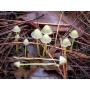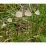 | 자실체 | 갓은 폭 0.5∼1.0(1.5)cm의 극소형. 어릴 때는 반구형∼무딘 원추형이다가 후에 종상∼둥근산형이 된다. 보통 중앙은 작고 무딘 돌출이 된다. 표면은 평활, 약간의 광택 끼가 있다. 황토색, 분홍색을 띤 갈색 또는 적색을 띤 갈색. 가운데 쪽이 진하다. 방사상으로 반투명의 줄무늬가 있고, 또 주름 모양 골이 져 있다. 가장자리는 예리하다. 식용가치가 없다. 주름살은 어릴 때는 분홍 끼가 있는 백색. 후에는 회백색. 손으로 만지면 적색 끼를 띤다. 대는 1.5∼4cm(굵기0.5∼1.2mm), 원주형, 흔히 위쪽이 하늘을 향해서 굽어 있다. 표면은 평활, 꼭지 쪽은 백색이거나 허연색. 아래쪽으로 점점 더 갈색을 띠며 속이 비었다. 부러지기 쉽고 신선한 것은 대를 자를 때 물기 가 맺히기도 한다. |