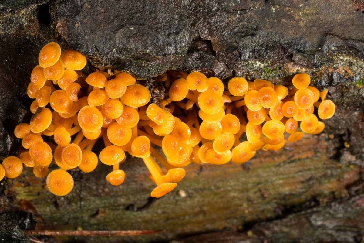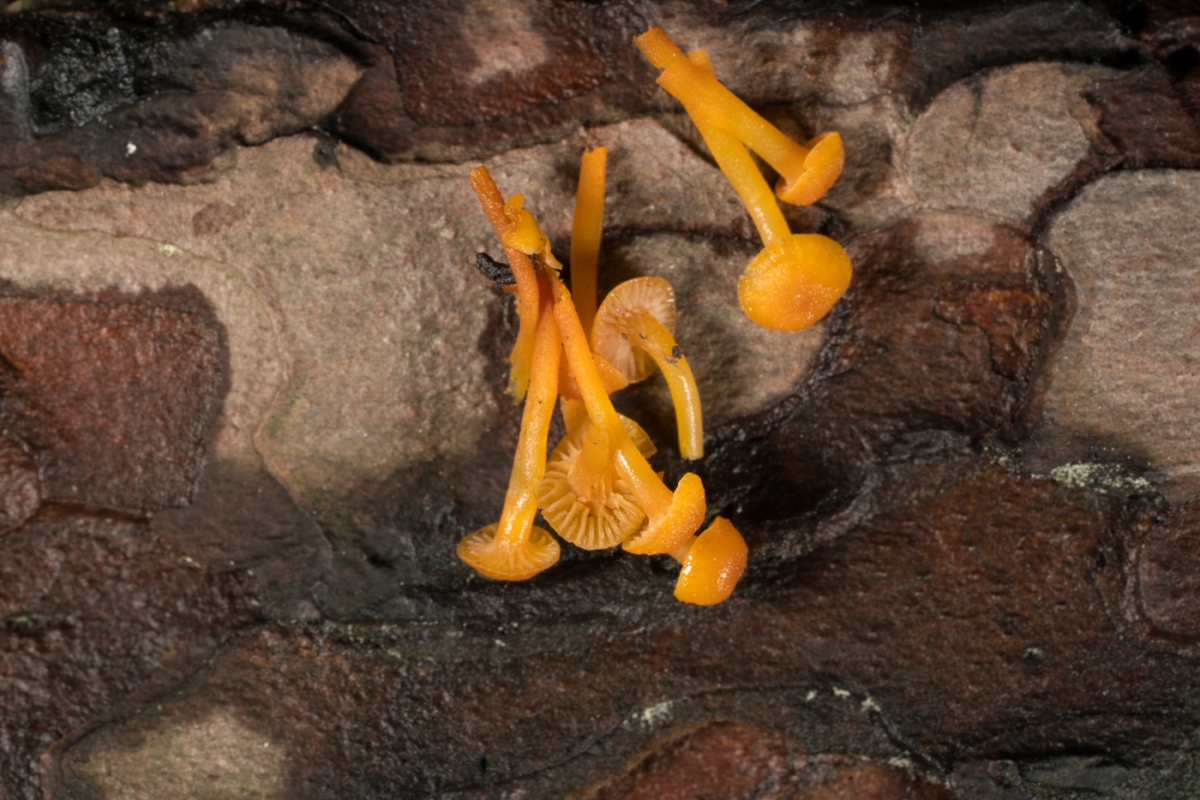 | 자실체 | 갓은 폭 0.5∼2(2.5)cm의 극소형. 중앙이 오목 들어간 둥근산형∼낮은 둥근산형이다가 후에 중앙이 오목해 진다. 표면은 평활, 다소 광택이 있고 오렌지갈색∼황갈색, 오목 들어간 곳이 진하다. 흔히 줄무늬가 길게 나타난다. 살은 얇고 갈색을 띤다. 비식용. 주름살은 어릴 때는 크림색이나 후에 황토갈색을 띤다. 약간 성기고 대에 띠붙음이면서 내리붙음. 대는 1∼3cm(굵기0.5∼2mm), 매우 가늘고 각질∼연골질, 위쪽은 황색을 띠고 아래쪽은 갈색을 띤다. |