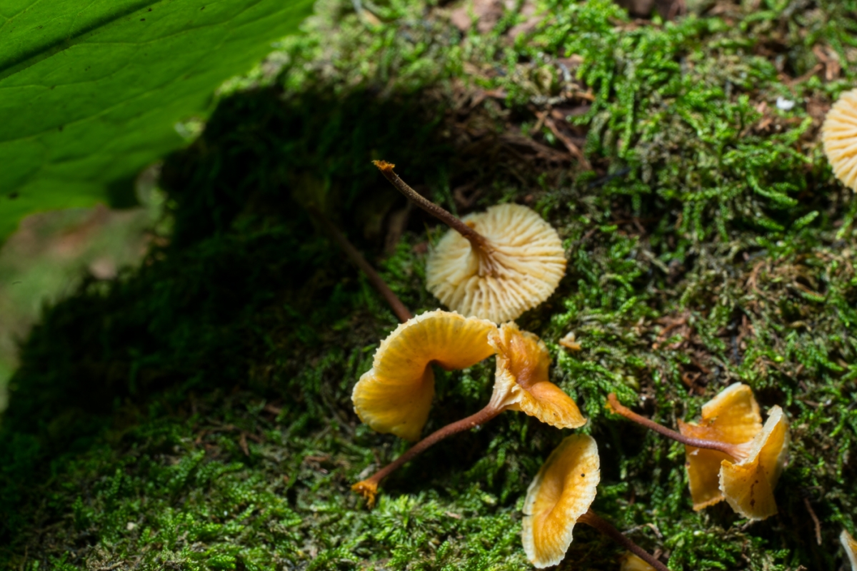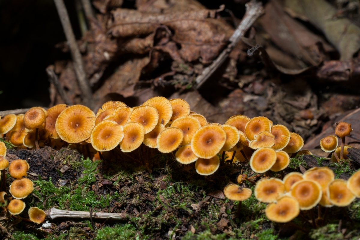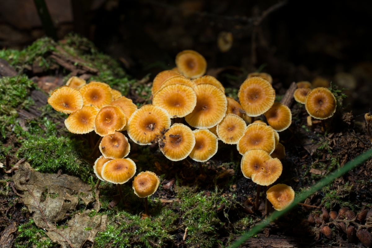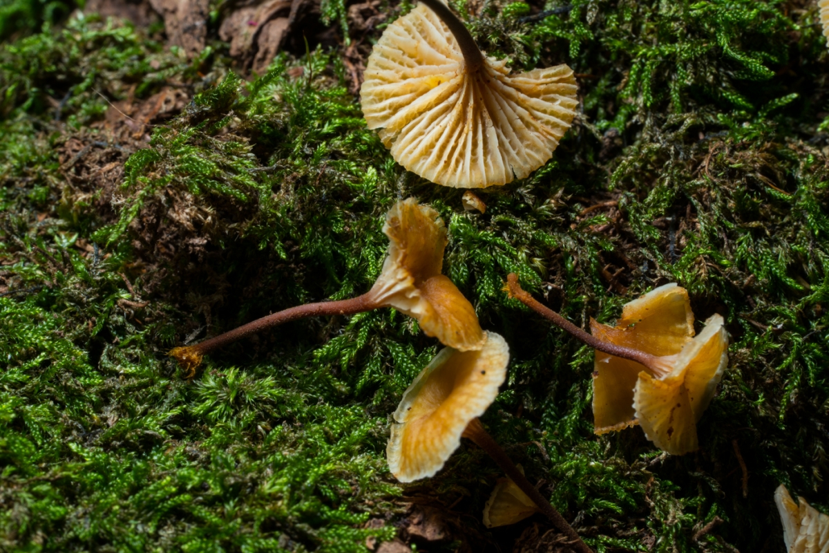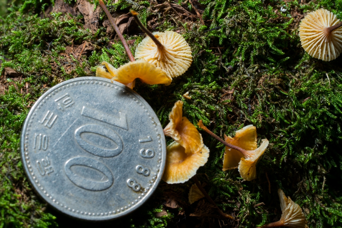 | 자실체 | 갓은 폭 1∼2.5cm의 극소형∼소형. 처음에는 중앙이 오목한 둥근산형이다가 후에 거의 평평하게 퍼지며 중앙이 오목하다. 흔히 중앙에는 젖꼭지 모양 오목해진다. 표면은 털이 없고, 방사상으로 홈선이 있다. 갈색을 띤 황색∼황갈색, 중앙부는 암갈색으로 진하다. 가장자리는 고르거나 또는 불규칙하게 들쑥날쑥 되기도 한다. 살은 얇고 가죽질이다. 비식용. 주름살은 대에 띠붙음이면서 내리붙음. 성기고 크림색∼황토색, 서로 간에 맥으로 연결되어 있다. 대는 2∼8cm(굵기 0.5∼2mm), 매우 가늘고 각질이며 흑갈색, 상부는 색이 연하다. 밑동에는 둥글게 뭉친 황갈색의 균사덩이가 피복되어 있다. |