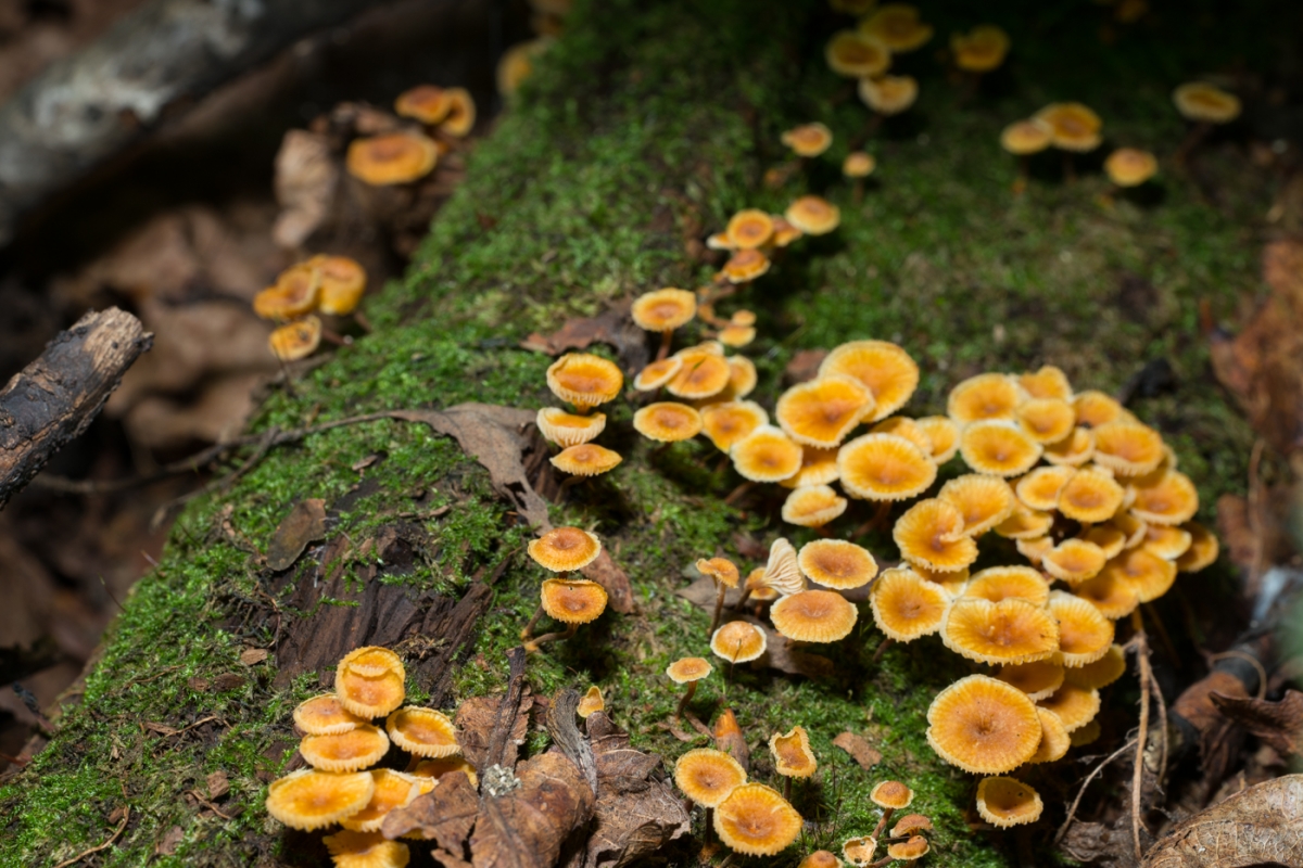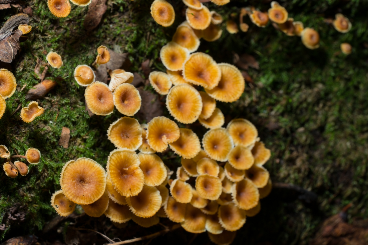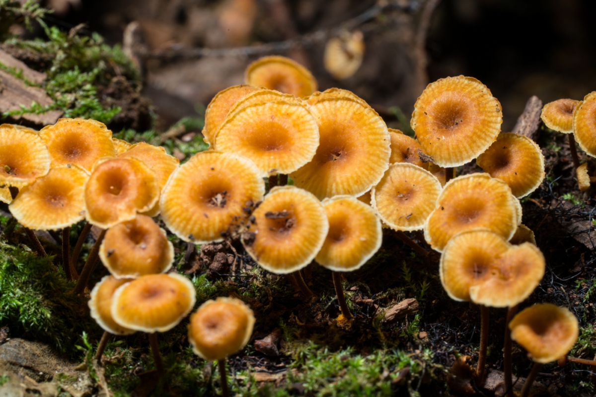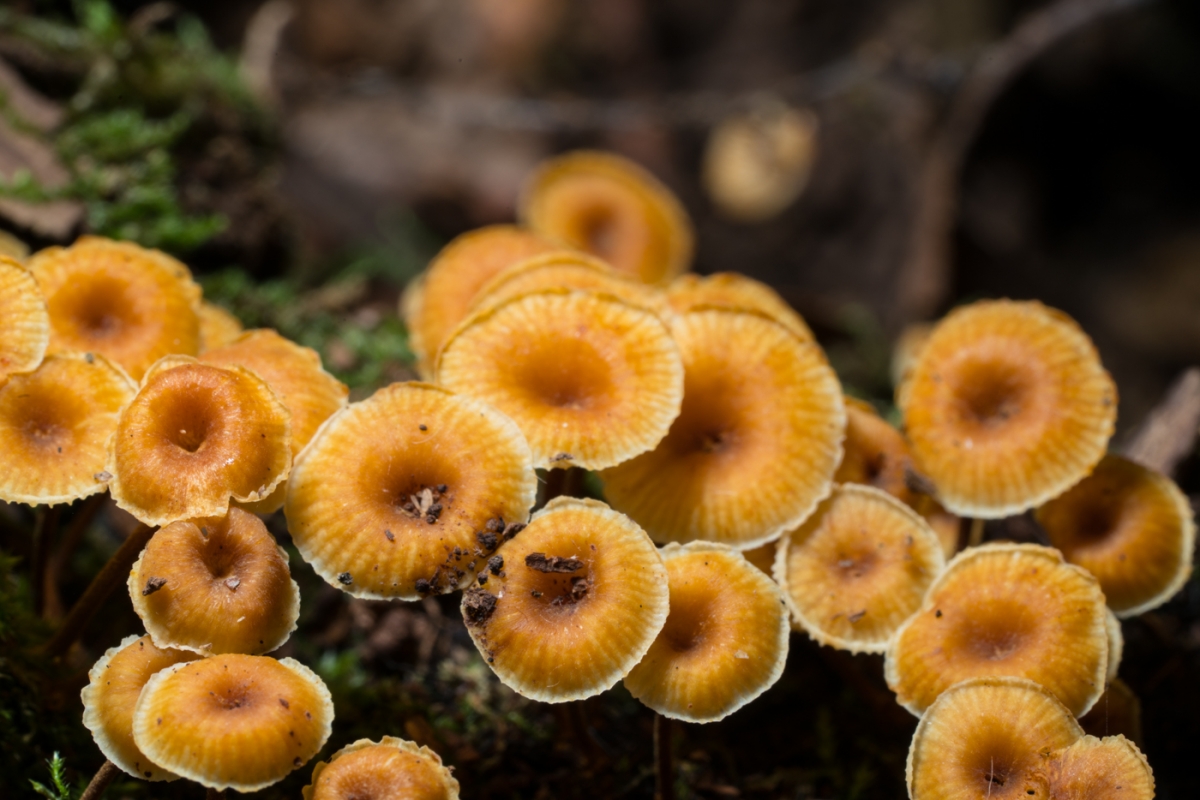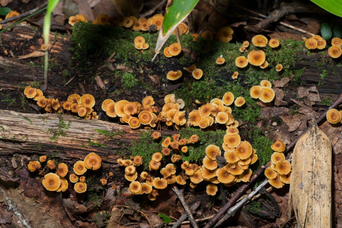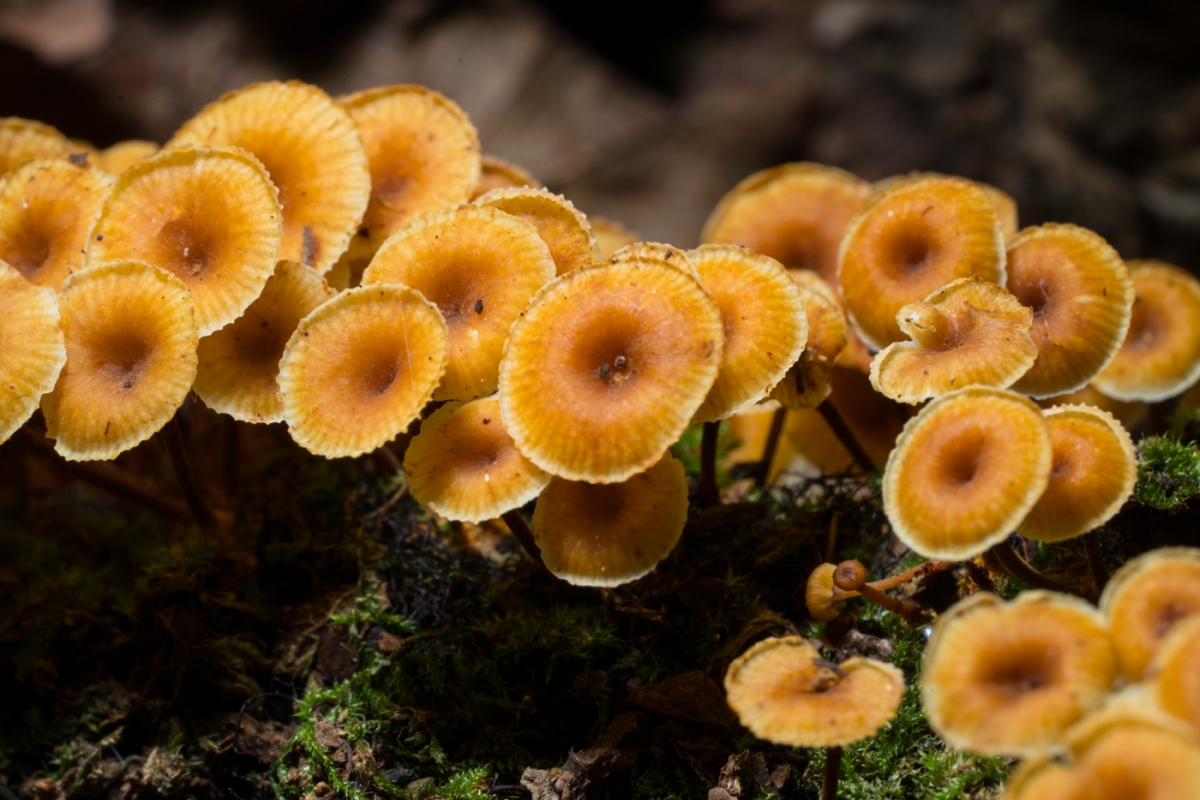 | 자실체 | 갓은 폭 1∼2.5cm의 극소형∼소형. 처음에는 중앙이 오목한 둥근산형이다가 후에 거의 평평하게 퍼지며 중앙이 오목하다. 흔히 중앙에는 젖꼭지 모양 오목해진다. 표면은 털이 없고, 방사상으로 홈선이 있다. 갈색을 띤 황색∼황갈색, 중앙부는 암갈색으로 진하다. 가장자리는 고르거나 또는 불규칙하게 들쑥날쑥 되기도 한다. 살은 얇고 가죽질이다. 비식용. 주름살은 대에 띠붙음이면서 내리붙음. 성기고 크림색∼황토색, 서로 간에 맥으로 연결되어 있다. 대는 2∼8cm(굵기 0.5∼2mm), 매우 가늘고 각질이며 흑갈색, 상부는 색이 연하다. 밑동에는 둥글게 뭉친 황갈색의 균사덩이가 피복되어 있다. |