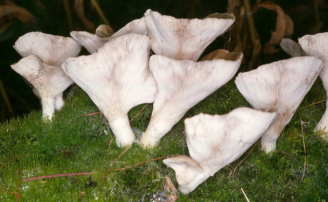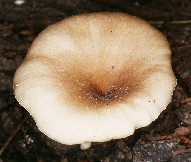 | 자실체 | 갓은 폭 5∼12cm의 중형∼대형. 흔히 여러 개의 대가 기부에서 갈라져 난다. 갓은 평평형이다가 중심이 약간 오목한 깔때기 형이 되고 때때로 가장자리가 물결형이나 갈라짐이 생긴다. 크림색이다가 연한 황갈색∼황갈색이 된다 때로는 보라색을 띤 갈색. 살은 백색, 식용. 주름살은 백색이다가 연한 살구색. 심한 대에 내리붙음, 폭이 넓고 성글다. 대는 길이 3∼8cm, 굵기 0.7∼2.5cm. 편심생 또는 중심생. 주름살과 비슷한 색. 오래되면 진해진다. |