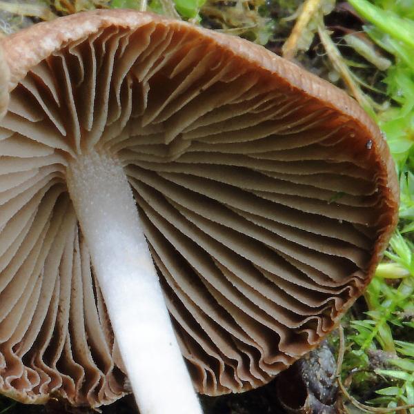 | 자실체 | 갓은 폭 1.8∼3cm의 극소형∼소형. 자주색 끼를 띤 암회색. 가장자리에 줄무늬가 있다. 주름살은 적색 끼가 있는 갈색, 날은 백색 대는 2.5∼3.5cm(굵기 1∼4mm), 백색. |
