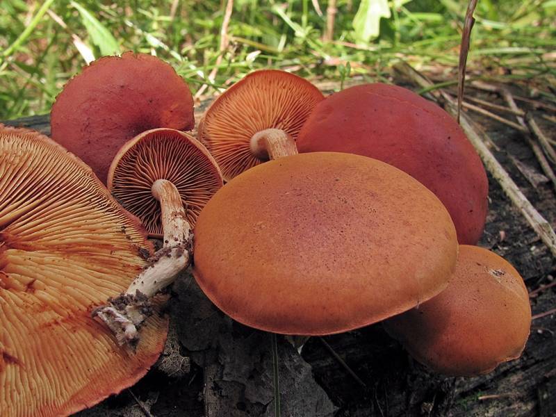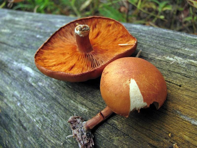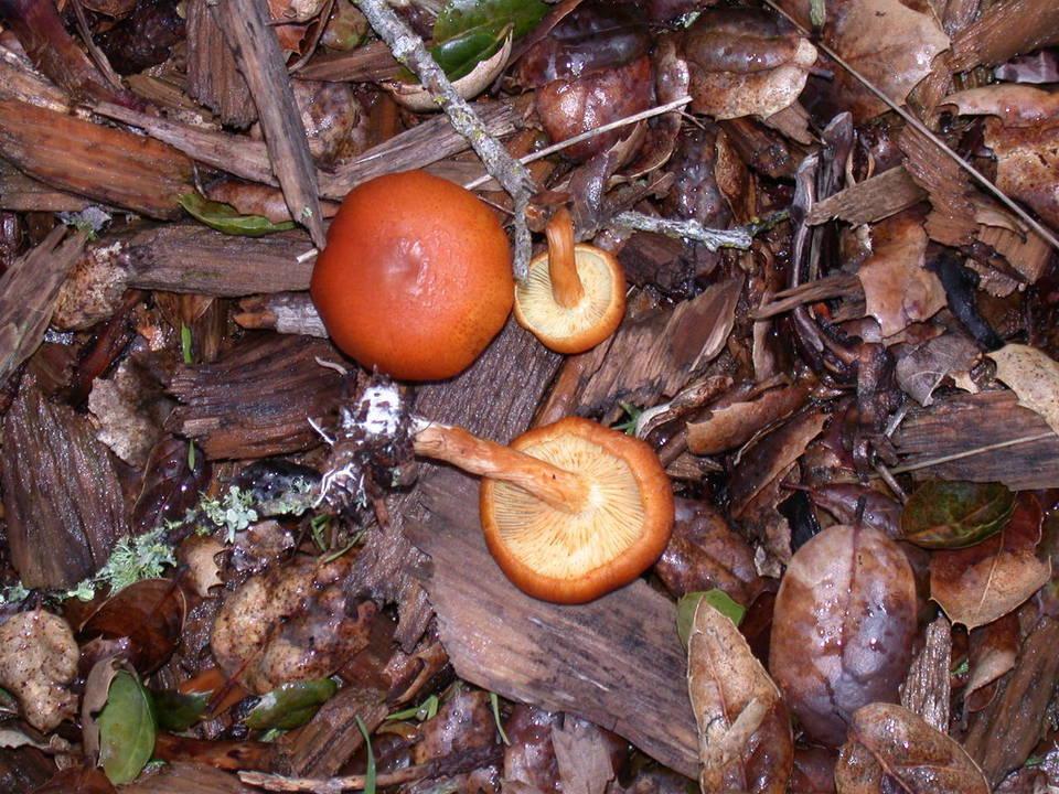 | 자실체 | 갓은 폭 1.5∼4cm의 극소형∼소형. 처음에는 원추상 종형이다가 둥근산형, 거의 평평한 형이 된다. 표면은 평활, 황갈색∼오렌지 갈색, 오래되면 가장자리에 다소 줄무늬가 나타난다. 살은 표면과 거의 같은 색. 약간 쓴맛이 있다. 비식용. 주름살은 처음에는 황색이다가 후에 녹슨 갈색이 된다. 촘촘하며 대에 띠붙음. 대는 2∼5cm(굵기2∼4mm), 상하 같은 굵기이거나 또는 위쪽이 약간 가늘다. 표면은 섬유상, 녹슨 갈색이고 속이 비어 있다. |