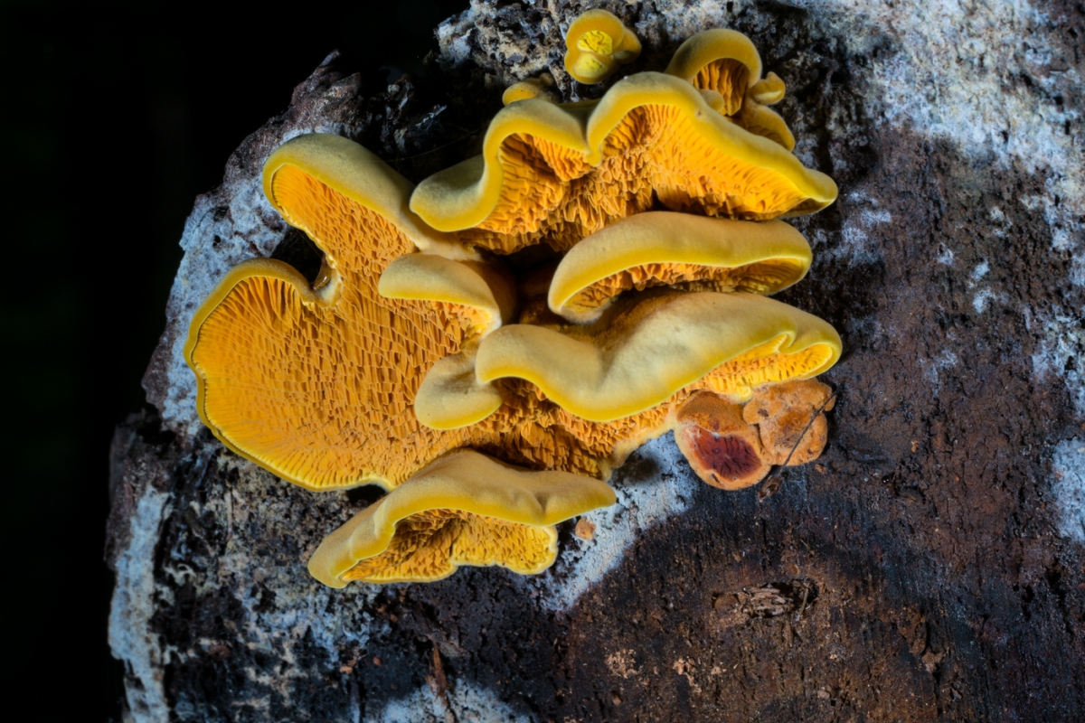 | 자실체 | 갓은 2∼5cm, 때로는 그 이상. 반원형, 콩팥형 또는 부채형인데 대가 없다. 가장자리는 강하게 안쪽으로 말린다. 표면은 황색. 거의 털이 없거나 또는 다소 비로드상이다. 살은 담황색, 신선할 때는 특유한 불쾌한 냄새가 있다. 주름살은 갓보다 진한 황색이거나 오렌지 황색, 오래되면 약간 올리브색을 띤다. 폭이 좁고 촘촘하며 방사상으로 배열되어 있고 불규칙하게 수회 분지된다. 주름살이 현저히 우글쭈글하다. 대는 없다. |