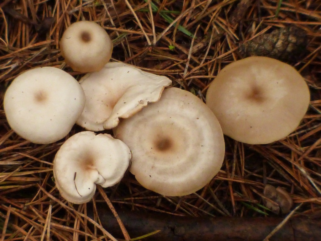| 자실체 | 갓은 3~6cm로 편평한 둥근산모양이고 어릴 때 가운데는 들어가서 배꼽형이다. 표면은 밋밋하며 강한 흡수성이고 가운데는 갈색의 크림백색이다. 건조하면 비단처럼 매끈하다. 습기가 있을 때 베이지갈색이다. 가장자리는 날카롭고 투명한 줄무늬선이 있다. 살은 백색으로 얇고 약간 버섯 냄새가 나며 맛은 부드럽다. 주름살은 자루에 대하여 내린주름살로 칙칙한 크림색에서 회색으로 되었다가 베이지갈색으로 된다. 가장자리는 밋밋하다. 대는 3.5~6cm, 굵기는 3~7mm로 원통형이며 간혹 눌린 상태로 약간 굽었고 비틀어진 것도 있다. 표면은 세로줄홈선이 있고 백색의 섬유상이다. 위쪽은 백색의 크림색이고 기부 쪽으로 회갈색이며 단단하다. 속은 차 있다가 비게 된다. |