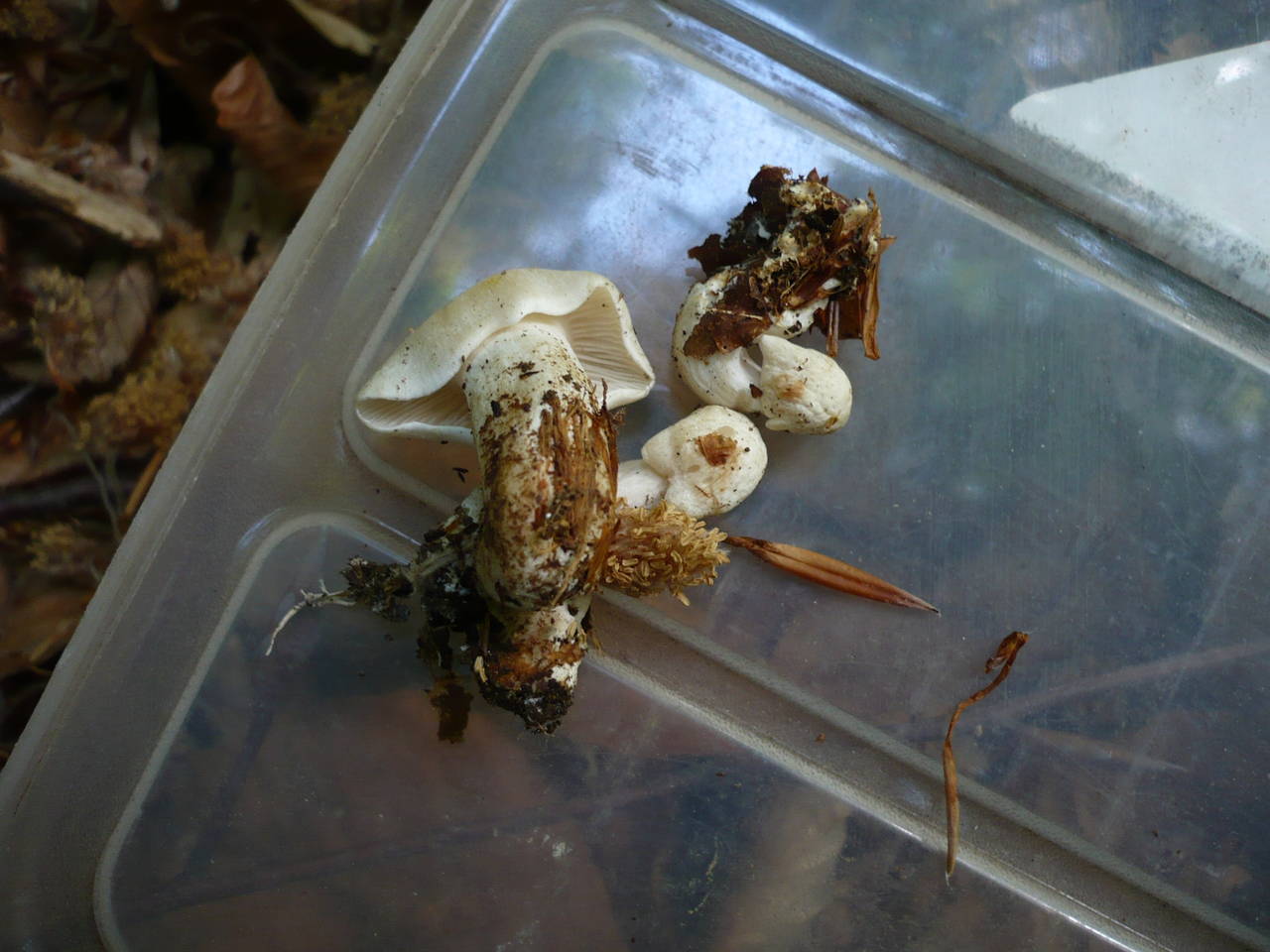 | 자실체 | 갓은 1~5cm로 넓은 둥근산모양에서 차차 편평해지고 넓게 가운데가 들어간다. 표면은 백색에서 연한 황색으로 되고 백색의 털이 밀집하여 두껍게 덮여 있다. 가장자리는 아래로 말리고 물결형이다. 주름살은 자루에 대하여 바른주름살-짧은 내린주름살로 밀생하며 폭은 좁고 백색에서 크림색을 거쳐 연한 황색으로 된다. 대는 10~40mm로 굵기는 2~10mm로 속은 차고 기부는 부풀고 굴곡진다. 표면은 백색에서 연한 크림색 또는 연한 핑크-연한 황색으로 꼭대기는 부풀고 아래쪽은 미세한 털이 밀집한다. |