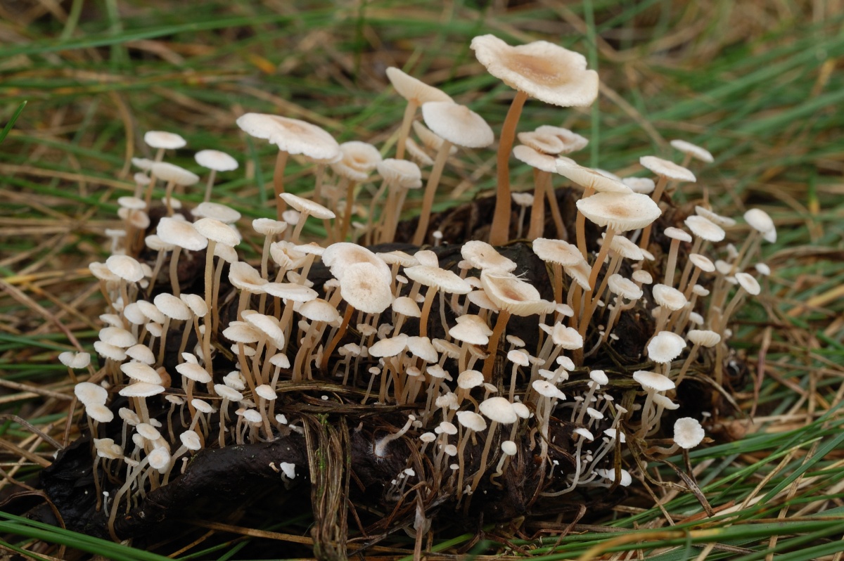 | 자실체 | 갓은 폭 0.2∼1.5cm의 극소형. 처음에는 반구형이다가 둥근산형∼평평해지며 간혹 가운데가 약간 들어가기도 한다. 표면은 미세한 털이 있으며, 중심부에 담황토색∼크림색, 가장자리는 연한 색∼백색을 띤다. 어릴 때는 담갈색을 띠기도 한다. 살은 백색∼습기가 있는 회백색. 식용하지 않는다. 주름살은 백색. 대에 띠붙음, 빽빽하다. 대는 1∼4cm(굵기 0.3∼1mm), 매우 가늘고 약간 황색 끼를 띤 크림색. 밑동은 썩은 식물체나 버섯 또는 부식질과 결합되어 있고 백색의 균사가 있다. |