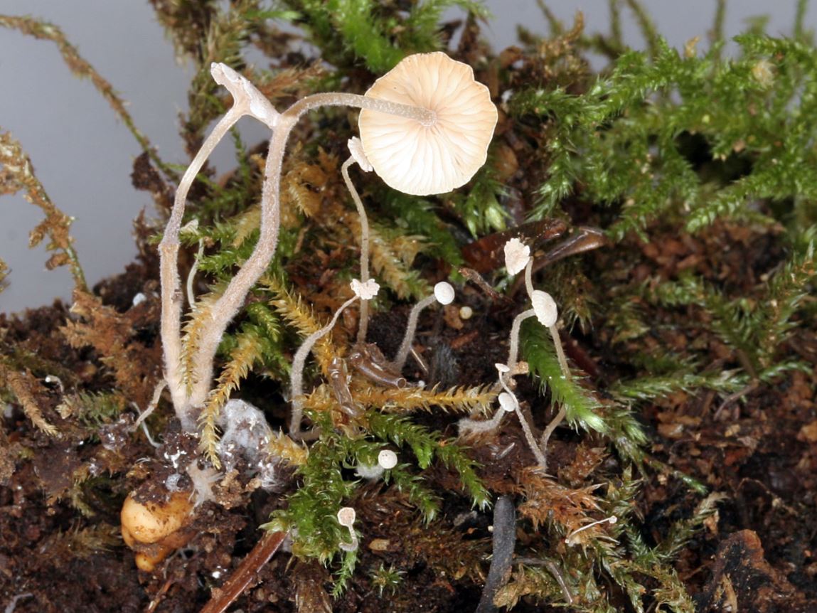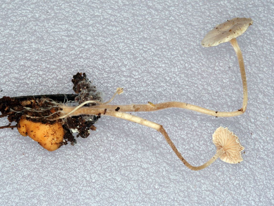 | 자실체 | 갓은 폭 0.4∼1cm의 극소형. 처음에는 둥근산형이다가 거의 평평해 진다. 표면은 평활, 때로는 중앙이 오목하게 들어가기도 한다. 거의 백색인데 중앙부가 약간 진하고 가장자리는 안쪽으로 다소 말려 있기도 하다. 식용가치가 없다. 주름살은 백색. 촘촘하고 대에 띠붙음. 대는 2∼4cm(굵기 ±0.5mm), 가늘고 위아래가 같은 굵기이며 연한 황색∼연한 갈색을 띤 백색. 밑동에는 면모형 털이 있고, 밑동에는 2∼3mm 크기 황갈색의 균핵이 있다. |