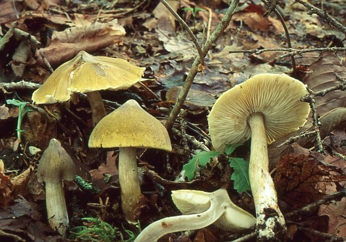 | 특징 | 소형. 파리 잡이(muscárium) 버섯. 담황색 끼의 바탕에 올리브갈색 섬유가 촘촘히 덮이고 중앙부가 뾰족하게 돌출. 대는 백색, 가운데가 굵은 방추형. |