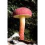 자실체 : 갓은 3∼10cm의 소형∼중형. 둥근산형이다가 넓은 둥근산형이 된다. 표면은 건조하고, 분홍적색 바탕에 다소 진한 색이거나 같은 색의 거칠고 큰 인편이 전면에 돌출 피복되고(때로는 솜털모양의 허연색 피복물), 후에 분홍갈색∼칙칙한 황색이 된다. 어릴 때 갓과 대 사이에는 막질로 연결되었다가 찢어지며, 너털너털하게 찢어진 막질이 남게 된다. 살은 허연색∼담황색, 절단하면 청변한다. 비식용