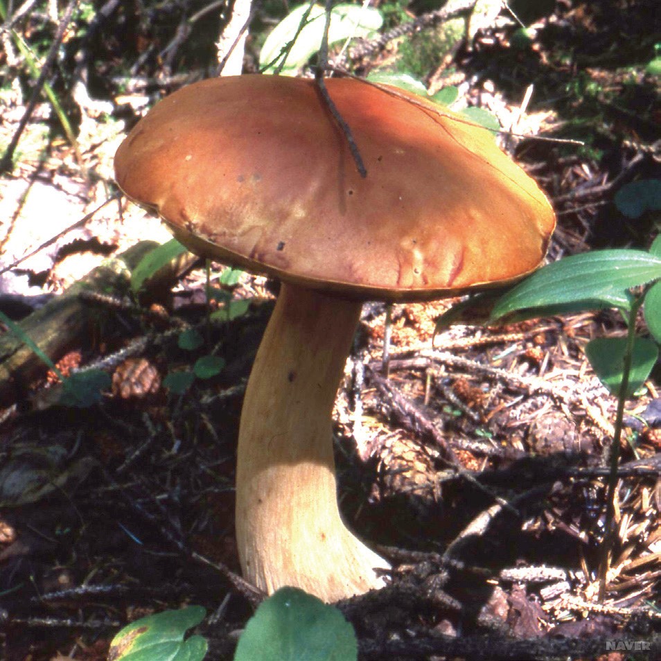 | 특징 | 중형~대형, 중앙부가 돌출한다. 표면은 마르거나 젖어 있을 때 점성이 있으며 녹슨 적색, 상처 시에는 올리브황색으로 변색, 관공은 백색에서 연한 올리브황색 그물버섯(Boletus edulus)과 다른 점은 녹슨 적색의 균모를 가진 점과 상처 시 구멍이 올리브황색으로 물드는 것이 차이점이다 |