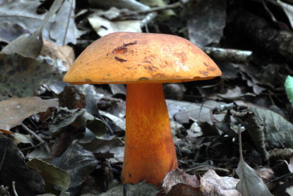 | 자실체 | 갓은 4∼8cm의 소형∼중형. 처음에는 반구형이나 퍼지면서 둥근산형이 된다. 표면은 습할 때 점성이 있고 약간 면모상 또는 평활하다. 선명한 오렌지색∼오렌지 적색, 상처를 받으면 청변한다. 살은 오렌지색. 관공은 구멍은 미세하고(2∼3개/mm) 원형이며 오렌지색∼오렌지적색, 상처를 받으면 청변한다. 관공은 대에 치붙음이고 구멍보다 다소 연한색이다. 대는 5∼7cm(굵기13∼17mm), 원주형 또는 아래 쪽이 다소 굵어진다. 표면은 무모 평활. 오렌지색∼오렌지적색이고 속이 차 있다. |