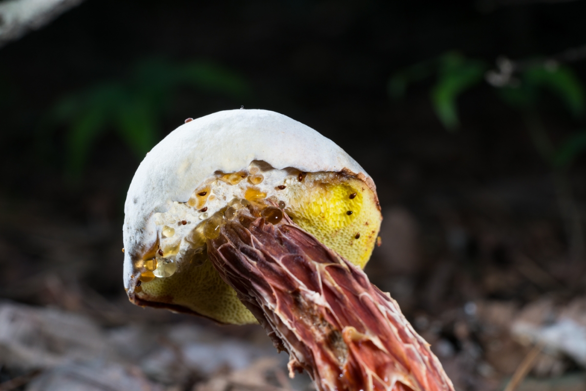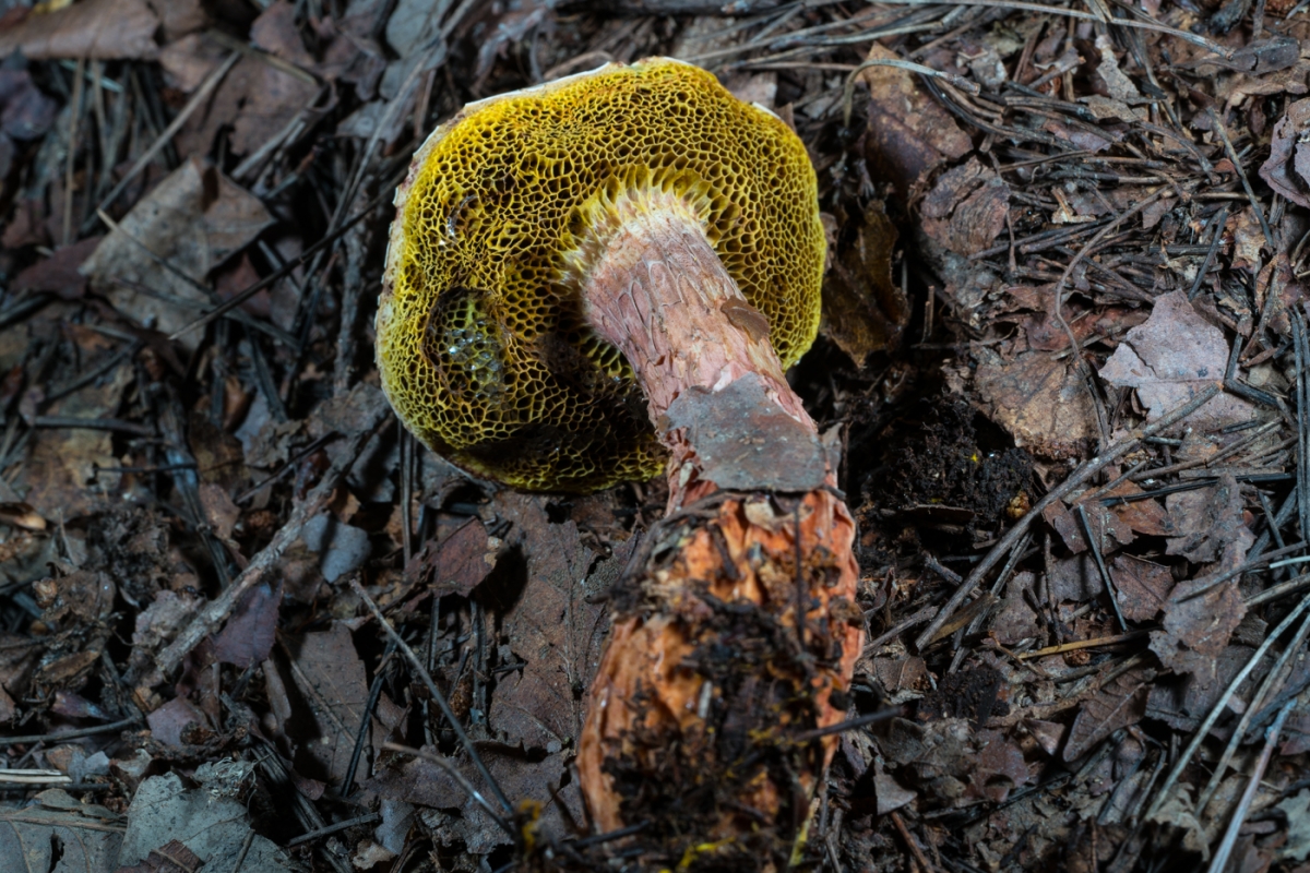 특징 : 중형∼대형. 참나무(quercỉnus) 버섯. 갓은 올리브색을 띤 황색∼담 갈회색, 또는 황갈색. 구멍은 적색, 관공은 담황색-탁한 황색, 청변 특징. 대는 연분홍색∼분홍색, 위쪽은 홍색 그물눈.