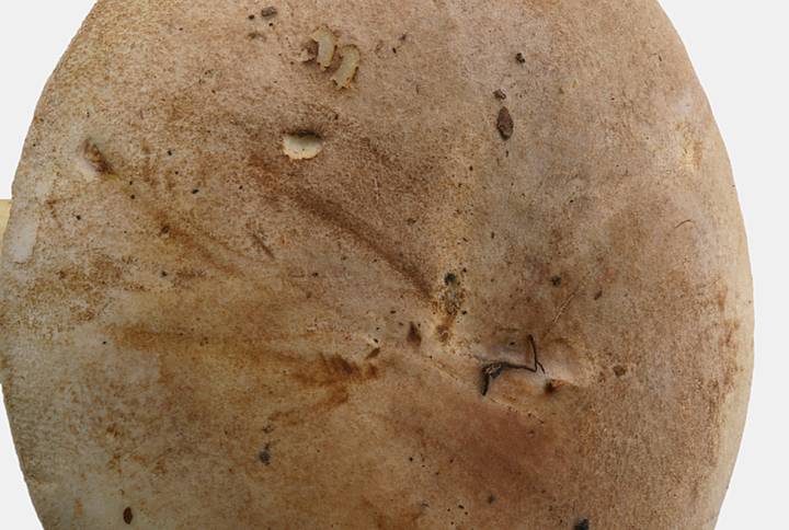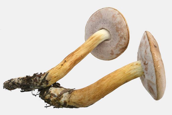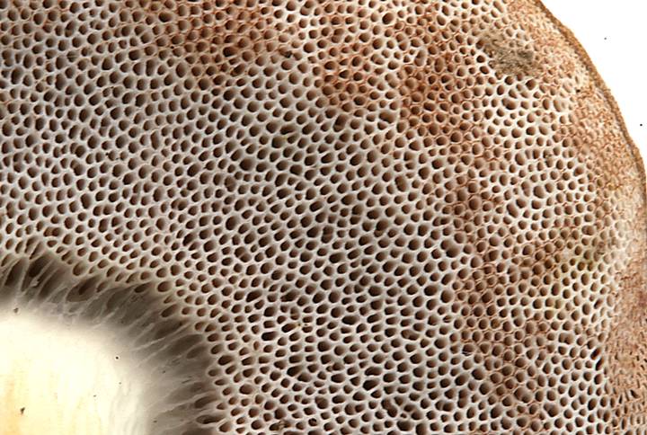 | 자실체 | 갓은 크기 4~9㎝정도로 어릴 때는 반원모양에서 둥근 산 모양을 거쳐 편평하게 된다. 갓 표면은 건조하고 어릴 때 벨벳 같은 질감이다가 오래되면 매끄러워지고, 어릴 때는 흑갈색에서 점차 회갈색~ 황갈색으로 변해가고 부분적으로 밝은 색을 띠기도 하며, 붓으로 그은 듯한 무늬가 있을 때도 있다. 살은 백색으로 쓴맛과 단맛이 약간 있으며, 상처가 나면 연한 홍색으로 변한다. 관공은 백색에서 분홍색으로 변해가며 대에 끝에 붙은 모양에서 홈파진 모양으로 되고, 구멍은 원형~다각형이며, 구멍의 밀도(간격)는 촘촘하고, 상처가 나면 연한 홍색으로 변한다. 대는 5~10㎝정도로 보통 아래쪽으로 굵어지며, 표면은 매끄러우며 어릴 때는 황갈색에서 점차 색이 밝아지고 녹슨 색 얼룩이 생긴다. 기부에는 백황색의 균사가 있다. |