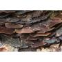 | 자실체 | 자실체는 반원형∼부채꼴. 거의 대가 없이 기물에 직접 부착되지만, 간혹 짧은 대가 측생하는 경우도 있다. 폭7∼12cm, 두께는 밑동 부근에 1cm 정도로 다소 얇다. 표면은 황갈색∼암갈색, 가장자리는 선황색. 방사상으로 현저한 주름이 잡혀 있고 표면이 다소 울퉁불퉁하며, 불선명한 테 무늬와 테 모양으로 요홈이 있다. 전면에 치밀하게 미세한 밀모층이 덮여있지만 육안으로는 거의 털이 없는 것처럼 보이고 두께는 0.5∼1mm 정도, 그 아래에 얇은 암색의 각질층이 형성되고 그 아래 살이 형성된다. 살은 목질이고 단단하며 황갈색. 대는 대부분없거나 극히 짧은 대가 있다. 관공은 길이 2∼3mm, 구멍은 미세하여 6∼7개/mm, 선황색이다가 후에 황갈색, 회갈색∼암갈색을 띤다. |