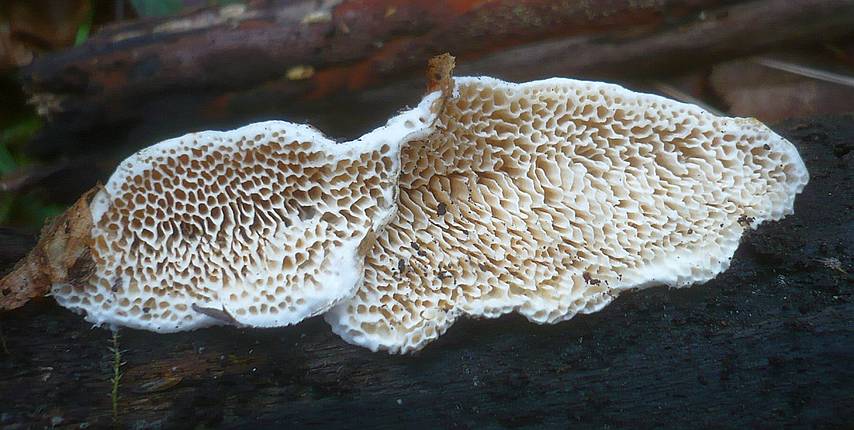| 자실체 | 자실체는 일반적으로 반배착생. 갓은 반원형∼조개껍질 형 또는 서로 연결해서 선반(띠)모양을 이루거나 다수 중첩해서 층생이 되기도 한다. 기질에 부착된 관공은 대에 내리붙음. 개개의 갓은 폭 1∼3cm, 폭 3∼6mm 정도의 소형. 표면은 거의 평활, 불선명한 테 무늬가 있다. 허연색∼회백색. 살은 1mm 내외이며 가죽질이다. 하면 관공은 극히 변화가 많으며 일반적으로 미로상이나 관공상, 주름살모양 등을 이루기도 한다. 간격은 1mm 정도이고 회백색∼회갈색. |
